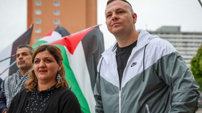 Die Kundgebung begann kurz nach dem Ende der gewerkschaftlichen Friedenskonferenz. So konnten einige der Teilnehmer:innen, die noch nicht ihre Rückreise antreten mussten, noch daran teilnehmen. Özlem Demirel, Abgeordnete der Linkspartei im Europaparlament, und Cem Ince, der für die Linkspartei im Bundestag sitzt, solidarisierten sich in ihren Grußbotschaften mit dem Kampf des palästinensischen Volkes gegen ihre Vertreibung und kritisisierten die militärische und politische Unterstützung der Bundesregierung für Israel.