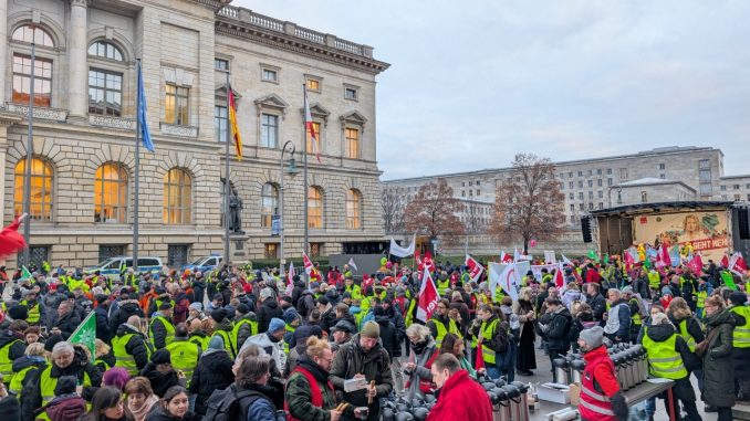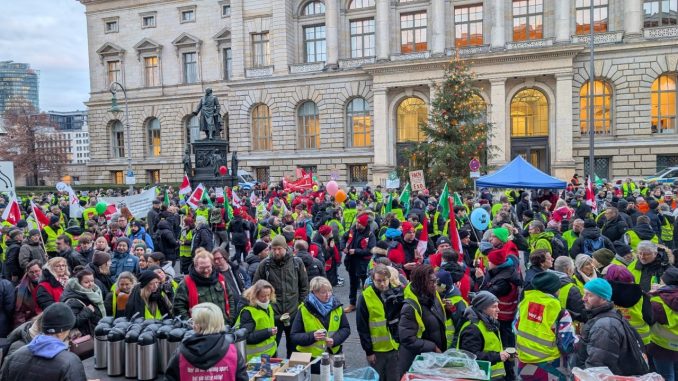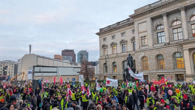 Da fast alle Sparmaßnahmen Beschäftigte treffen, die unter den Tarifvertrag der Länder fallen, hatte ver.di zusammen mit den anderen an der Tarifrunde der Länder beteiligten Gewerkschaften den zweiten Warnstreik in Berlin auf den Tag gelegt, an dem im Abgeordnetenhaus die Sparbeschlüsse für den Doppelhaushalt 2026/27 verabschiedet werden sollten. Dies führte dazu, dass am 10.12.2025 auch viele Kolleg: innen aus den Sozialverbänden gekommen waren und Mitglieder von kleineren Gewerkschaften, die nicht dem DGB angehören, wie etwa die der Bühnenangehörigen, der Musik- und Orchestermitglieder, der Schauspieler und der Beschäftigten der Opern- wie Tanzensembles.